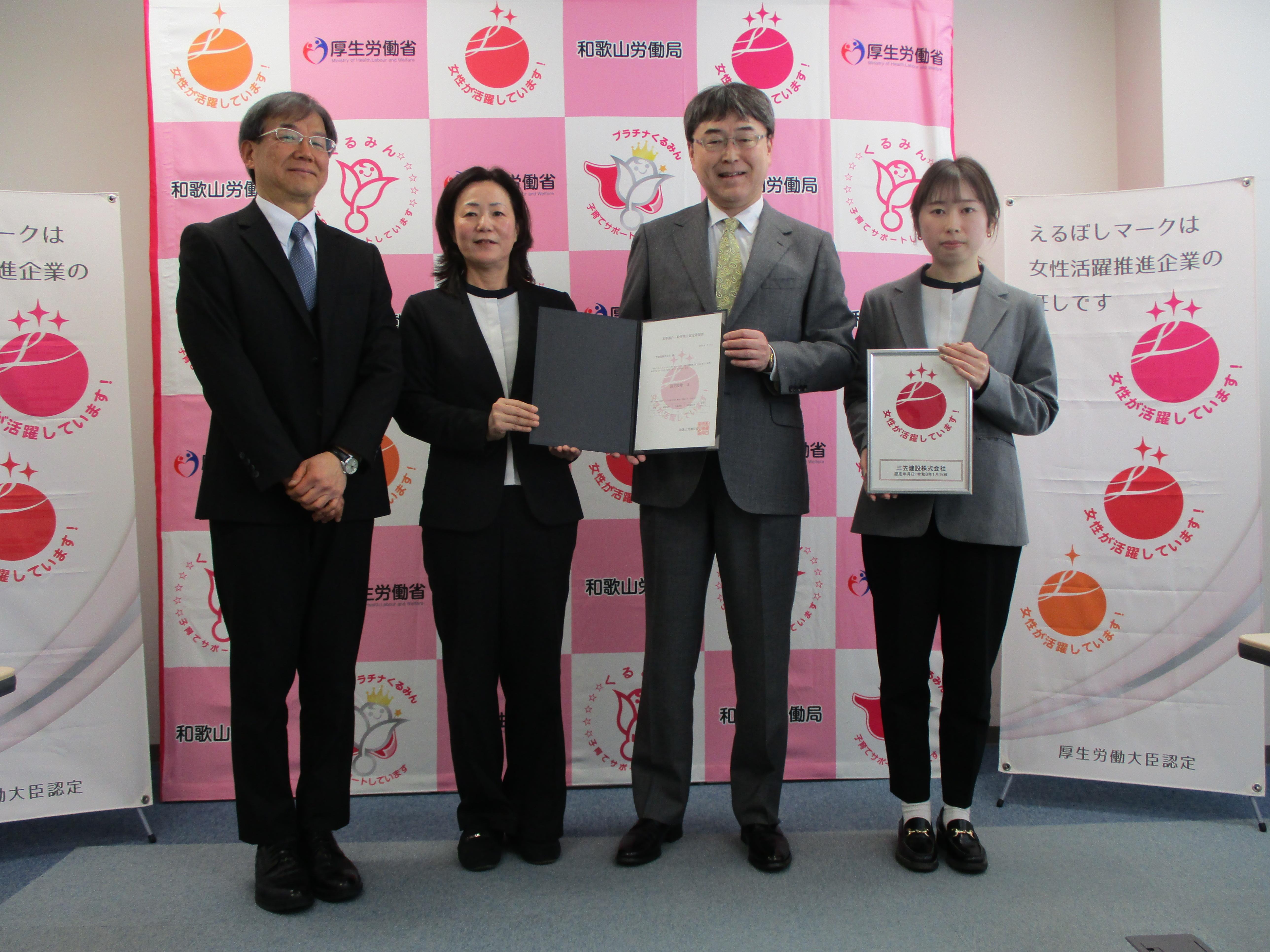 この度、弊社は和歌山労働局において「えるぼし」認定通知書交付式に出席いたしました。