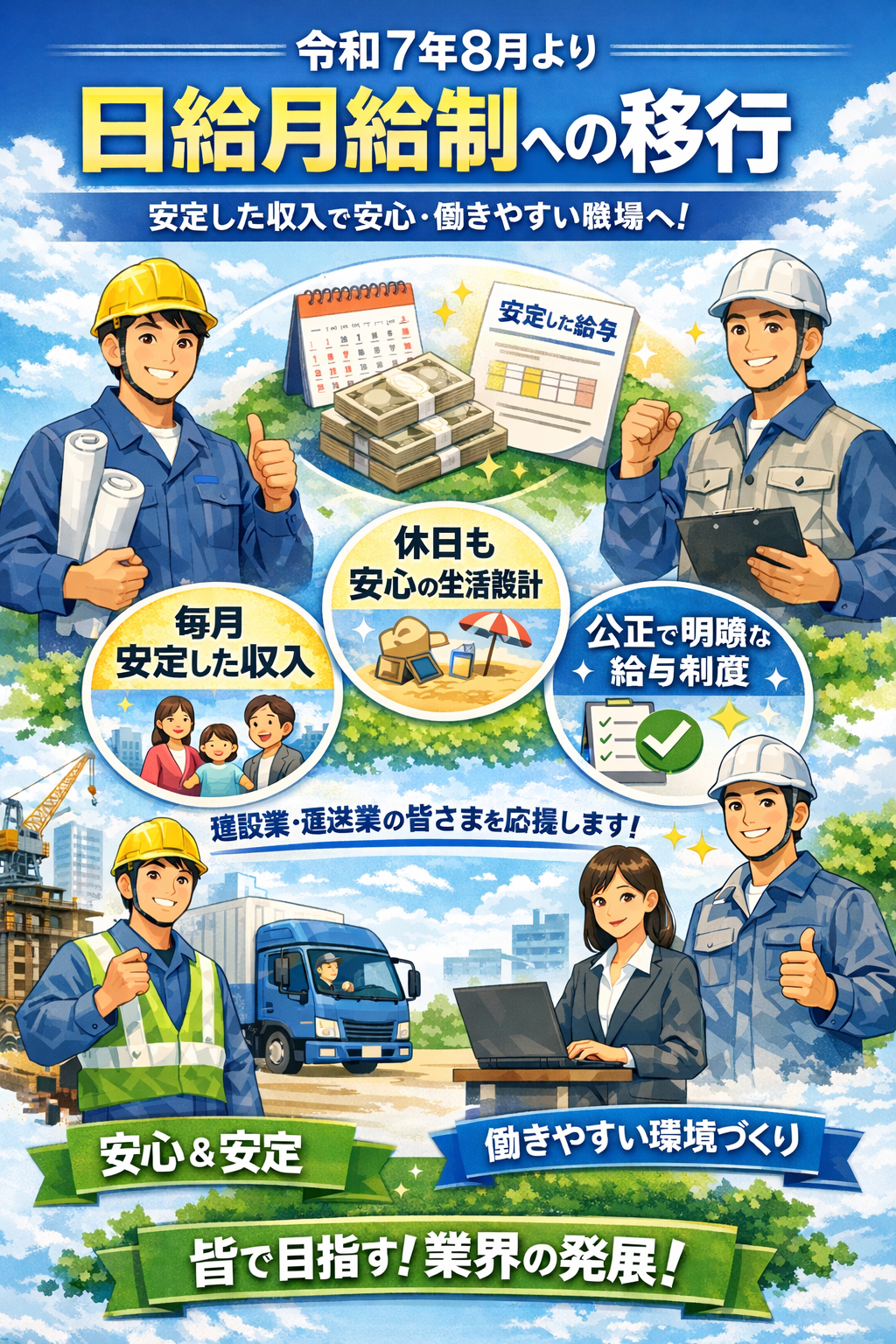 当社は「社員の働きやすさ」と「雇用の安定」を重視した働き方改革の一環として、令和7年8月より全社員の賃金形態を【日給月給制】へ移行いたしました。